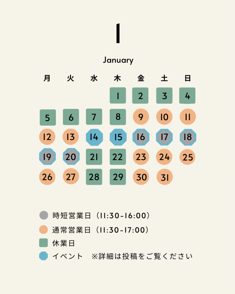 1月の営業スケジュール 2026 1/08 未分類 2026年1月8日1月の営業スケジュールです。14(水)〜20(火)はイベントの為店舗の営業時間は11:30-16:00です。今月も皆様のご来店お待ちしております。 未分類 POP UPイベントのお知らせ 関連記事 POP UPイベントのお知らせ 2026年1月7日 イベント出店のお知らせ 2024年8月26日 長期休業のお知らせ 2024年8月18日 【期間限定】bloomオリジナルドリップバックコーヒー プレゼント中! 2024年8月18日